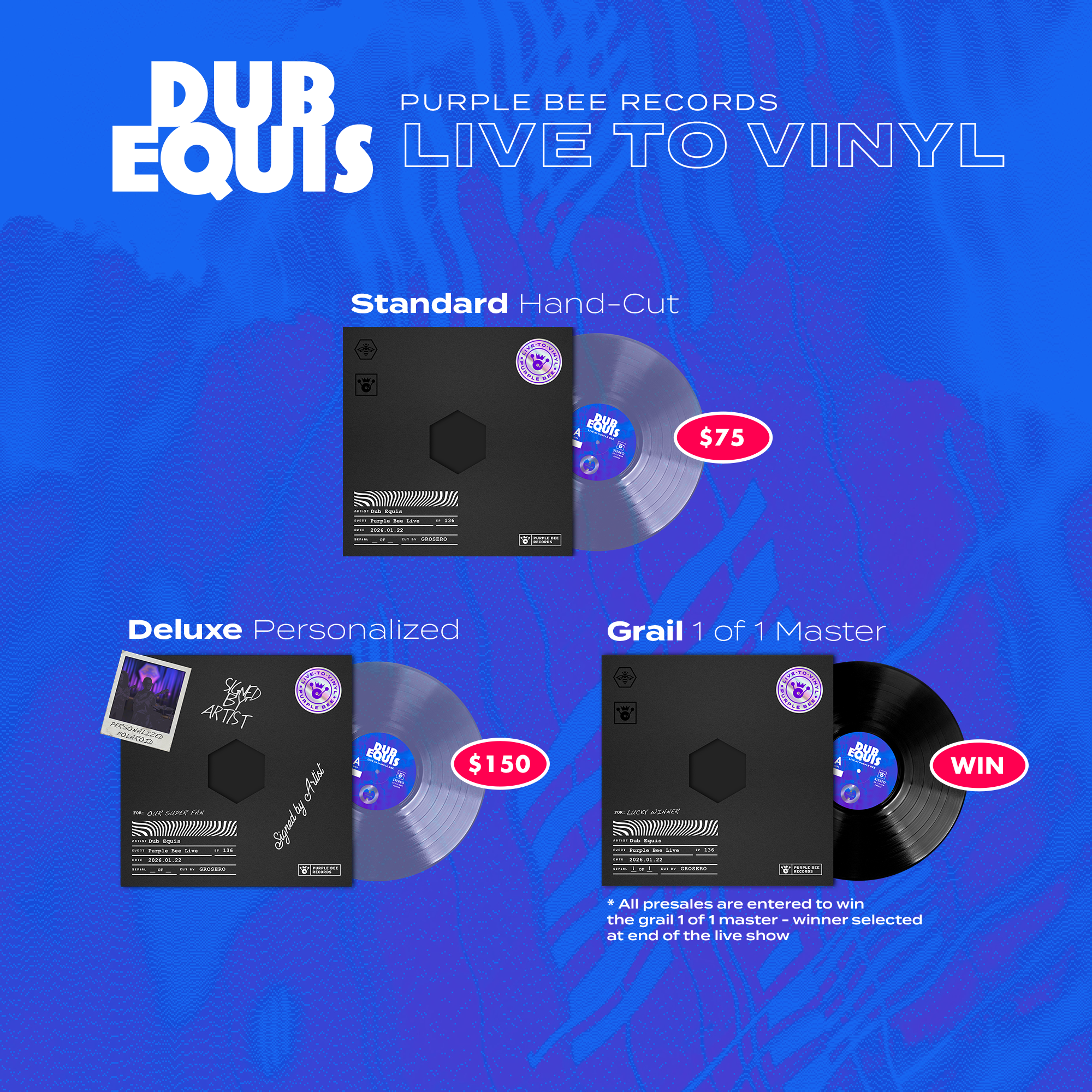 • Seek the Grail: All vinyl customers are eligible to be chosen for the 1-of-1 grail that will be recorded live in the room that night.